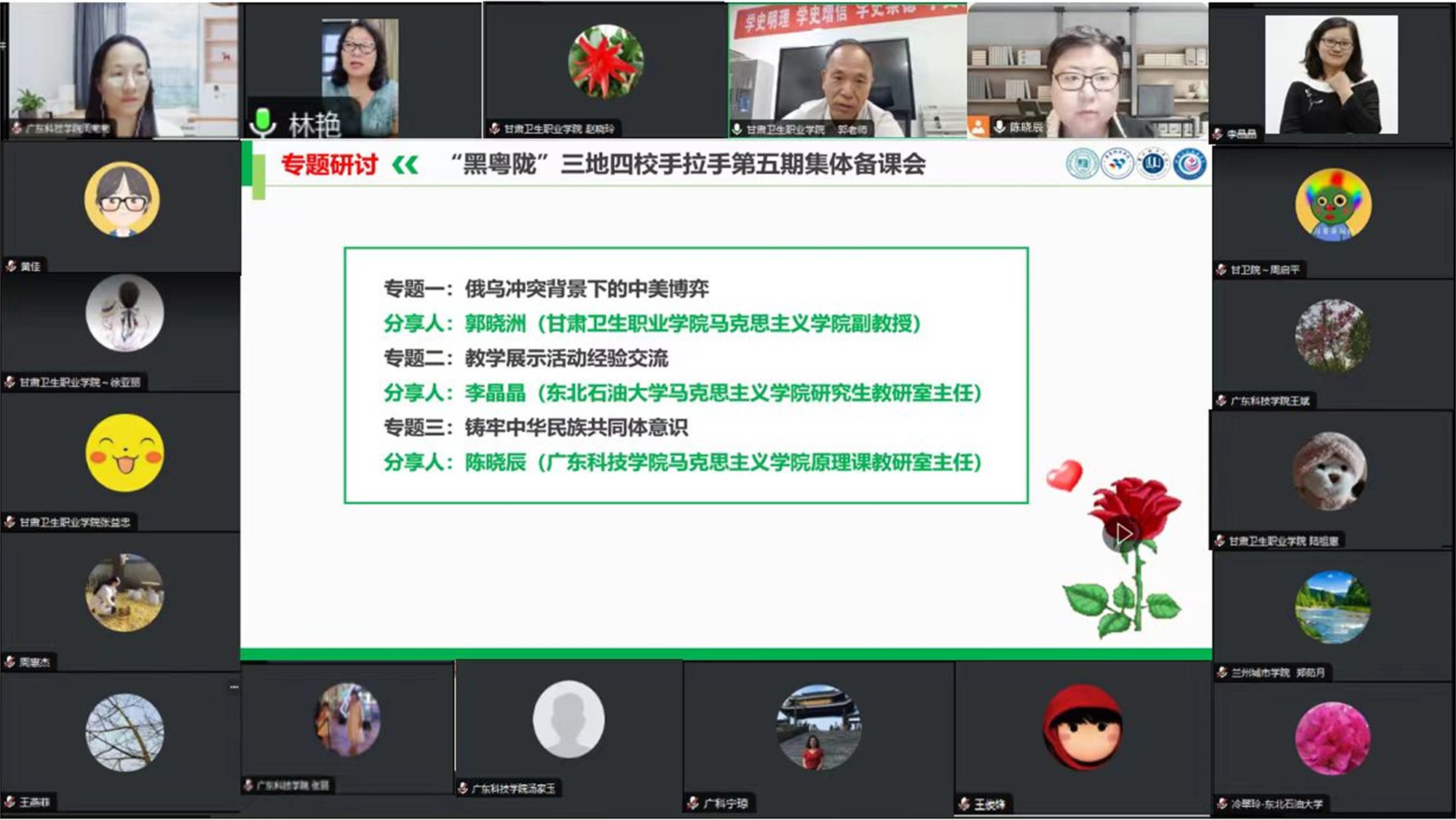 为进一步提升365英国上市集团官网思政课教学质量,加强兄弟院校间的交流学习。6月18日晚,365英国上市集团官网马院与东北石油大学马院、广东科技学院马院、兰州城市学院马院联合开展“黑粤陇”三地四校手拉手第五期集体备课会活动。