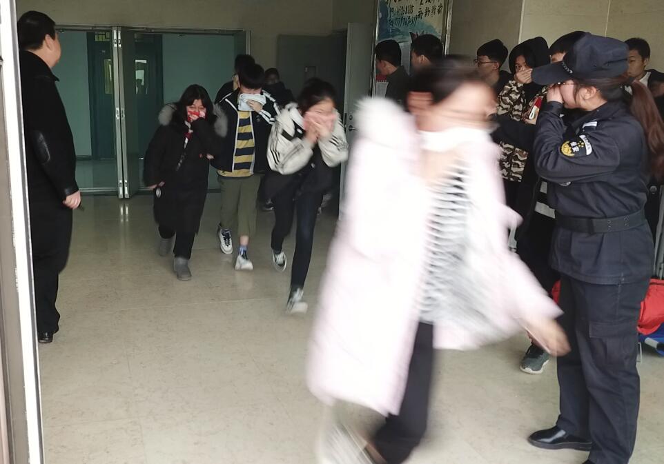 在刘生肸同志一声令下,各项演练活动有序展开。演练内容由学生逃生自救疏散、消防设备应急保障、灭火器材使用方法、灭火器材体验操作等项目构成。其中学生逃生自救疏散演练项目比较真实地模拟了火灾突发现场,同学们用湿毛巾捂住口鼻,由教学楼及公寓各楼层的安全员迅速组织疏散。整个疏散过程紧张有序、实用性强,收到了预期效果。