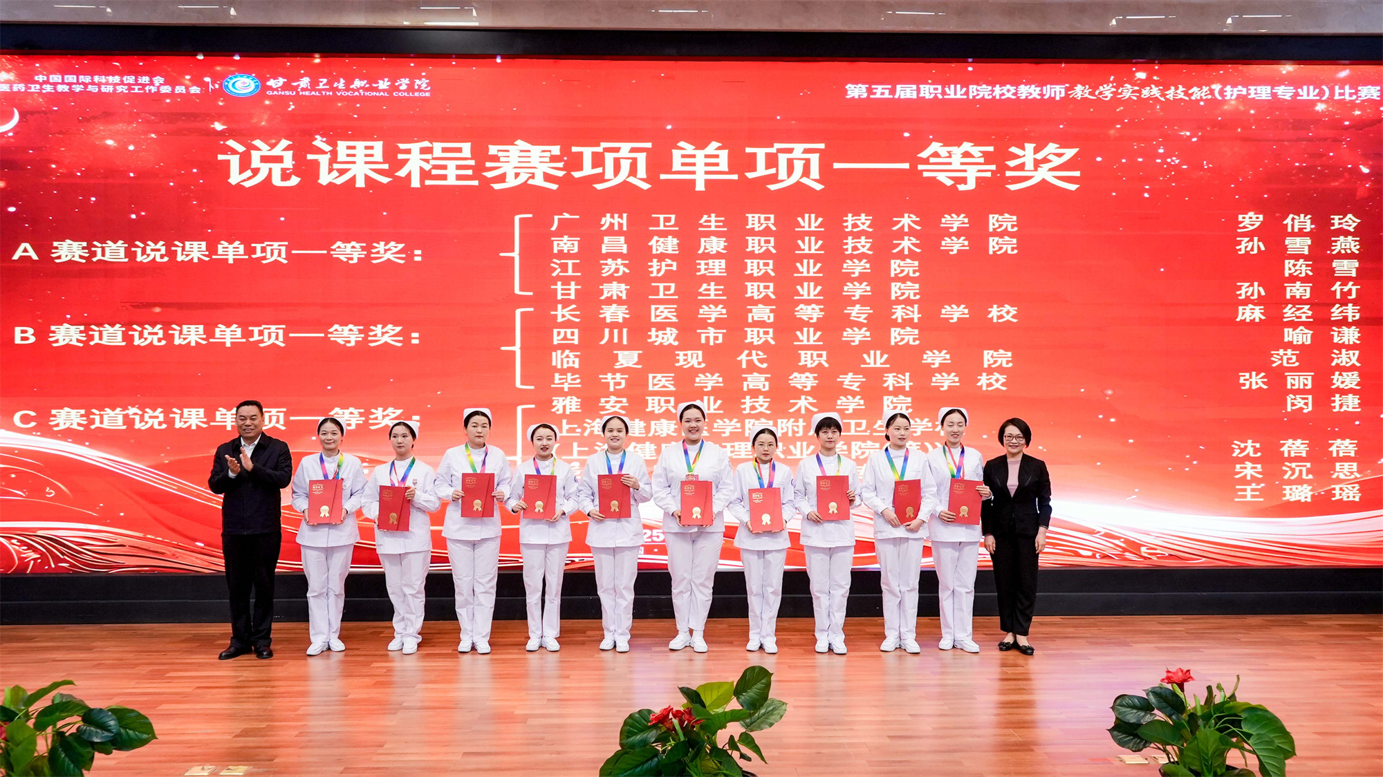 闭赛式上,高璀乡、刘华平、王文海先后宣读了说课程赛项单项奖、护理技能赛项单项奖、团体奖、优秀指导教师奖名单。与会领导、来宾为获奖选手、团队颁发获奖证书、奖牌和奖杯。365英国上市集团官网选手、团队表现优异,斩获多项荣誉。孙南竹老师荣获说课程赛项A赛道一等奖,韩媛媛老师荣获说课程赛项A赛道二等奖,学校荣获护理技能赛项A赛道一等奖、高职组团体一等奖,温萌老师、达朝锦老师荣获优秀指导教师奖。