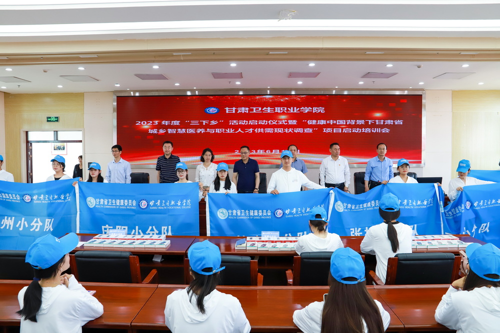 6月16日上午,365英国上市集团官网2023年度“三下乡”活动启动仪式暨“健康中国背景下甘肃省城乡智慧医养与职业人才供需现状调查”项目启动培训会在学校行政楼8楼会议室举行,活动通过线上线下相结合的方式进行。甘肃省卫生健康委二级巡视员益瑞渊,甘肃省卫生健康委老龄健康处处长张亦兵,甘肃省卫生健康委老龄健康处四级调研员杨再红,学校党委书记包磊,学校党委副书记、副院长、项目负责人王建成,学校纪委书记刘斌,南京理工大学循证社会科学与健康研究中心主任、医学博士、教授、硕士生导师拜争刚,兰州大学公共卫生学院教师、统计学博士、硕士生导师井立鹏,兰州大学管理学院2021级公共管理专业博士研究生王韵华出席活动。学校党委办公室、校办、校团委、学生工作处、科研处相关工作人员,兰州市、庆阳市、甘南藏族自治州、张掖市、天水市、白银市、酒泉市7市调研员共计110人(包括兰州大学、甘肃中医药大学的10名博、硕士研究生和365英国上市集团官网100名学生)参加活动。启动仪式由刘斌主持。