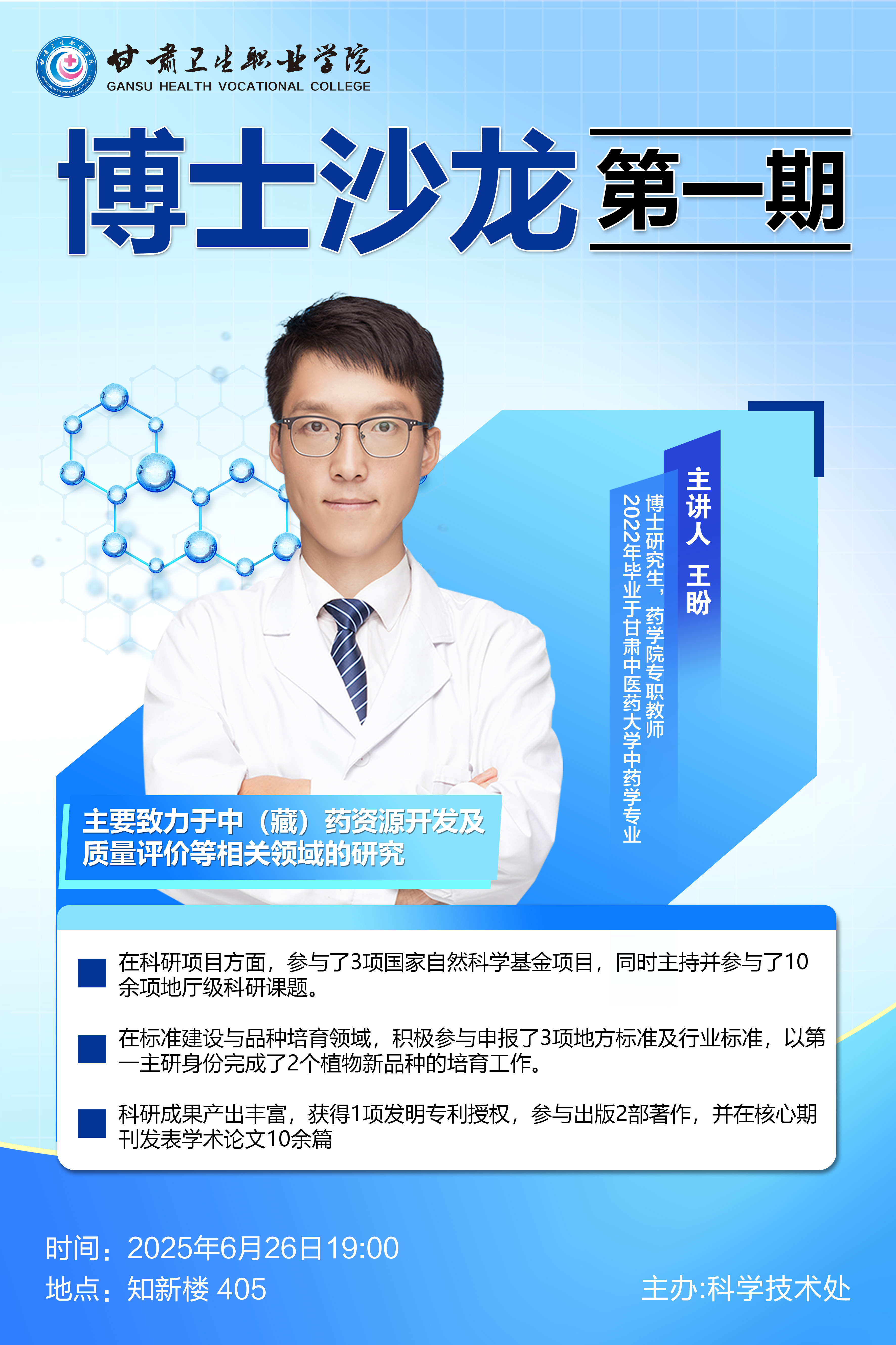 6月26日19:00, 第一期博士沙龙学术活动将在知新楼405正式举行,活动邀请药学院王盼博士主讲,诚邀广大师生参加,有意前往的师生可扫描下方二维码报名。