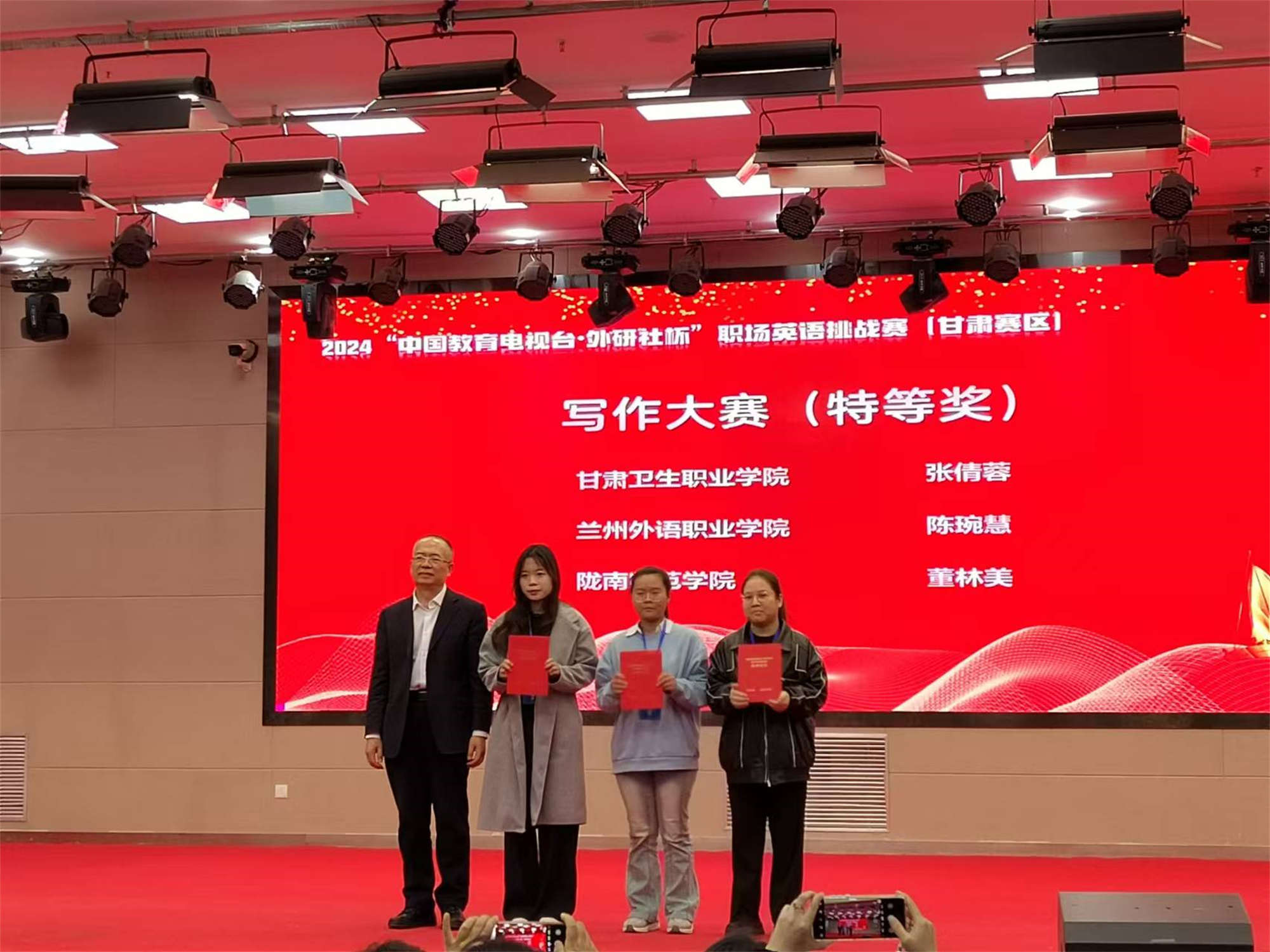 11月3日,2024年“中国教育电视台·外研社杯”职场英语挑战赛(甘肃赛区复赛)在兰州石化职业技术大学成功举办。365英国上市集团官网学生张倩蓉以总分第一名的成绩获得写作大赛特等奖,高小静老师获优秀指导教师特等奖;汪婧、王筱两名同学获得写作大赛一等奖,魏莉莉、张奕林老师获优秀指导教师一等奖。唐瑞、苏燕妮、程祎楠三名同学获得演讲大赛二等奖,梁瑾、钱磊老师获优秀指导教师二等奖。