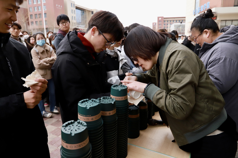 随后,各位领导、老师及学院学生会成员给前来参加活动的各位学生分发种子及花盆等物品,并登记相关信息,为后期活动跟进和成果展示做准备。同学们积极性高,对培育种子充满信心,在随机的采访中,他们都有着精细的计划和培养方案,可见同学们对此次活动的重视与热爱。