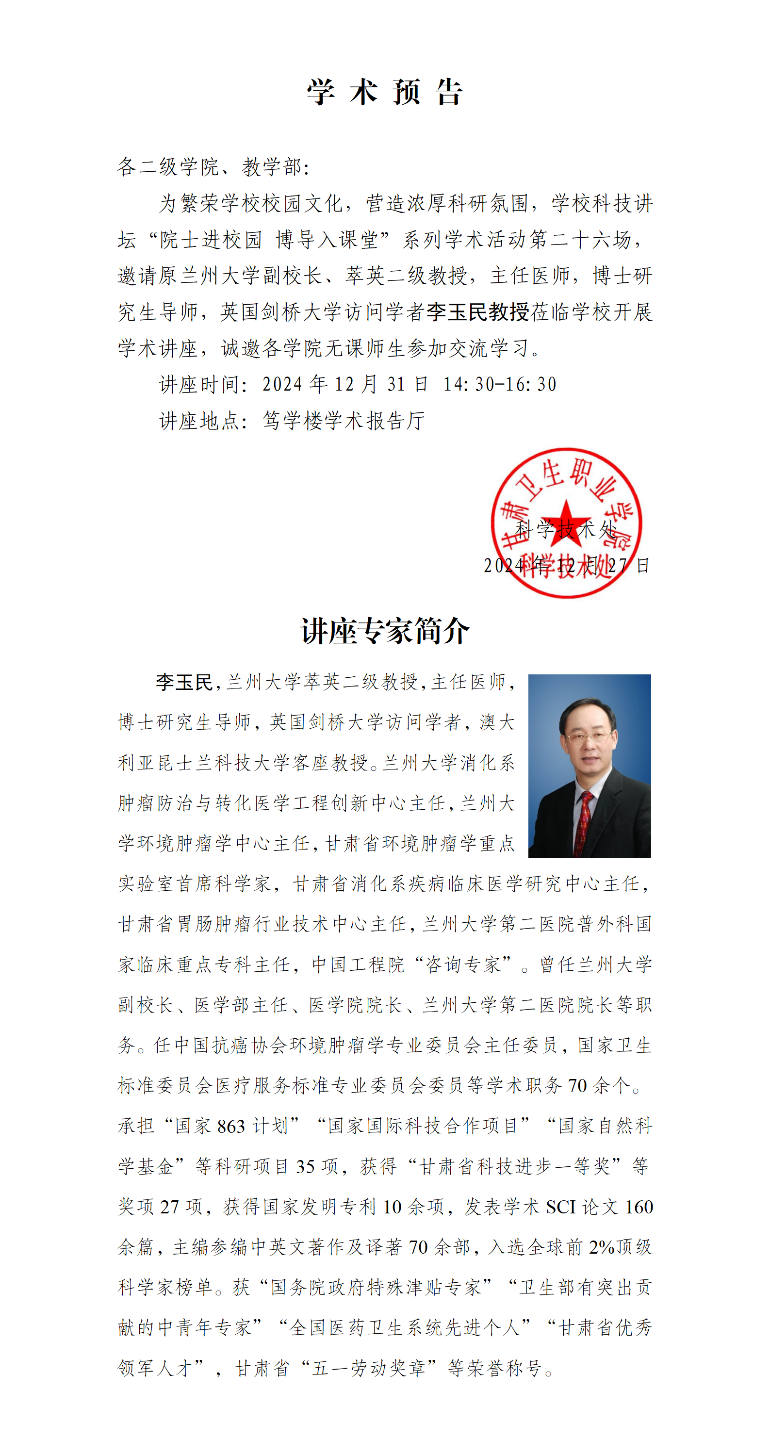 【院士进校园 博导入课堂】学术讲座通知