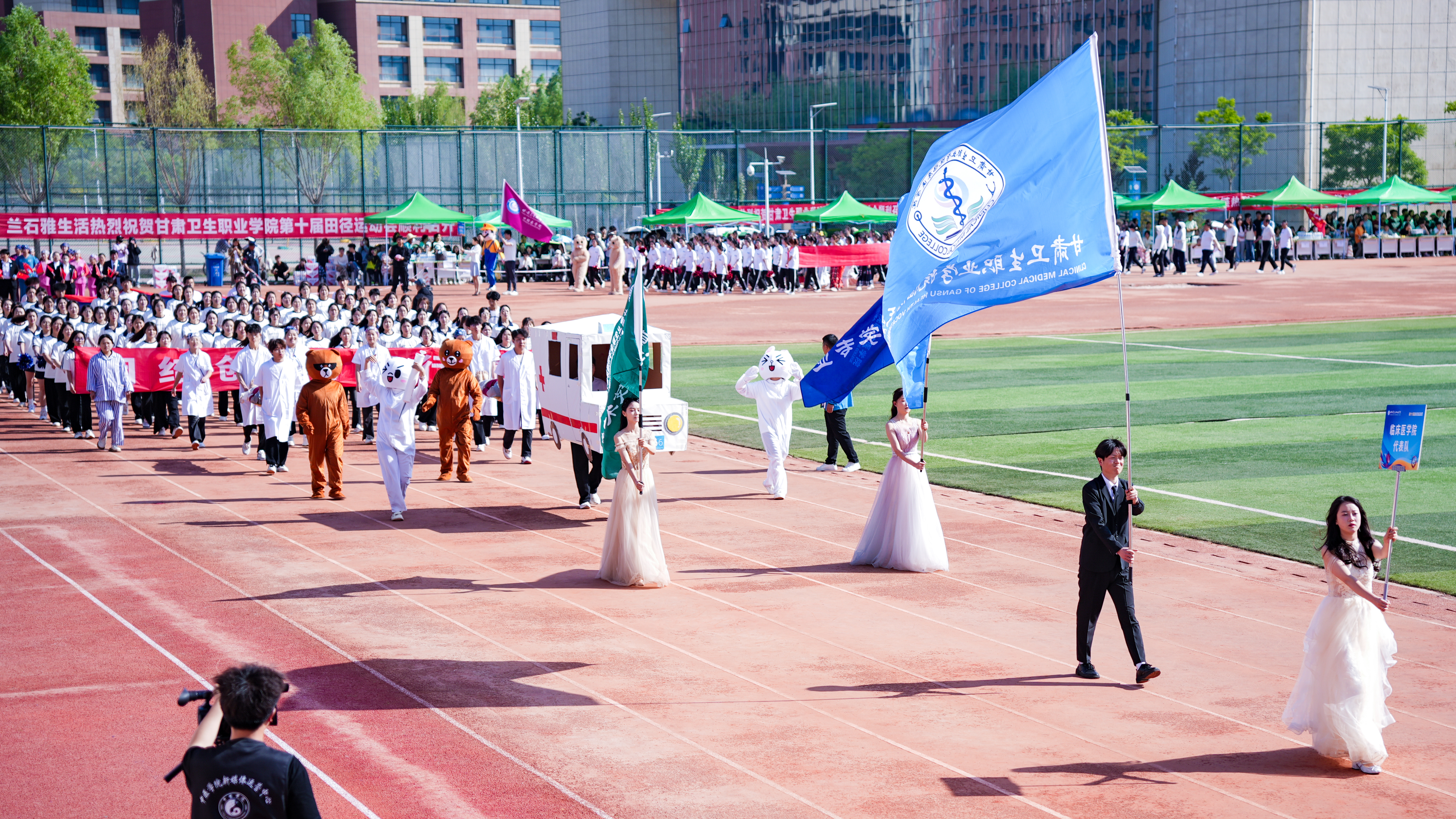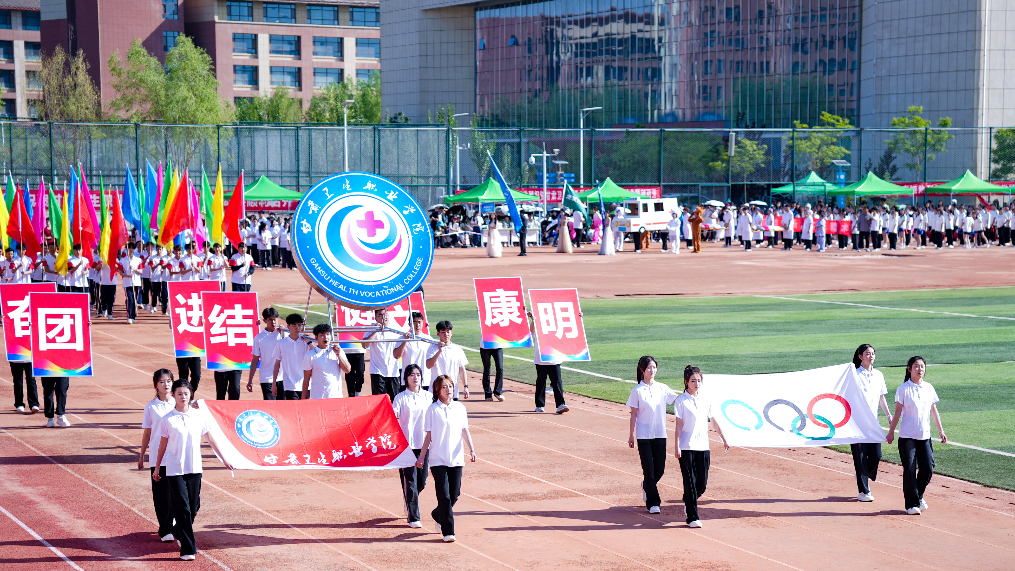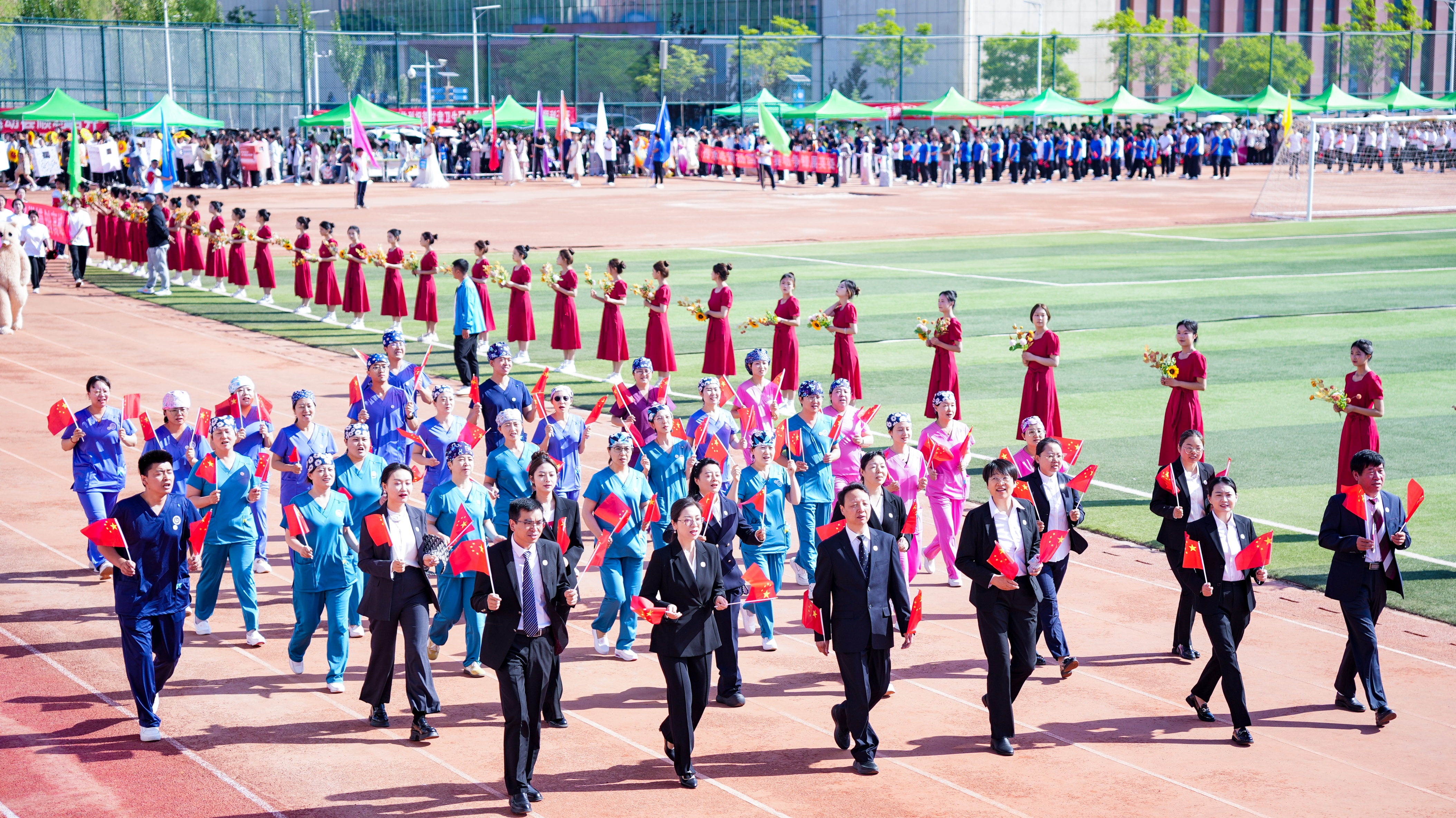 伴随着激动人心的进行曲,国旗、校旗、校徽、口号(文明、健康、团结、奋进)、彩旗队、花束队、裁判员代表队、各专业运动员代表队方阵依次入场。各方阵队伍步伐矫健、口号嘹亮,各专业和学生社团结合自身特色,精心设计了独特的过场表演,有的身着专业服装展示医护人员的风采,有的高举院训横幅表达医学生救死扶伤的郑重承诺,有的用响亮的口号传递着青春的激情,充分展现了同学们的意气风发与创新精神。由食堂厨师、物业工作者、校园超市员工组成的勤笃公司(服务保障)方队首次亮相运动会,展现了默默守护校园的后勤人团结奋进的别样风采。
