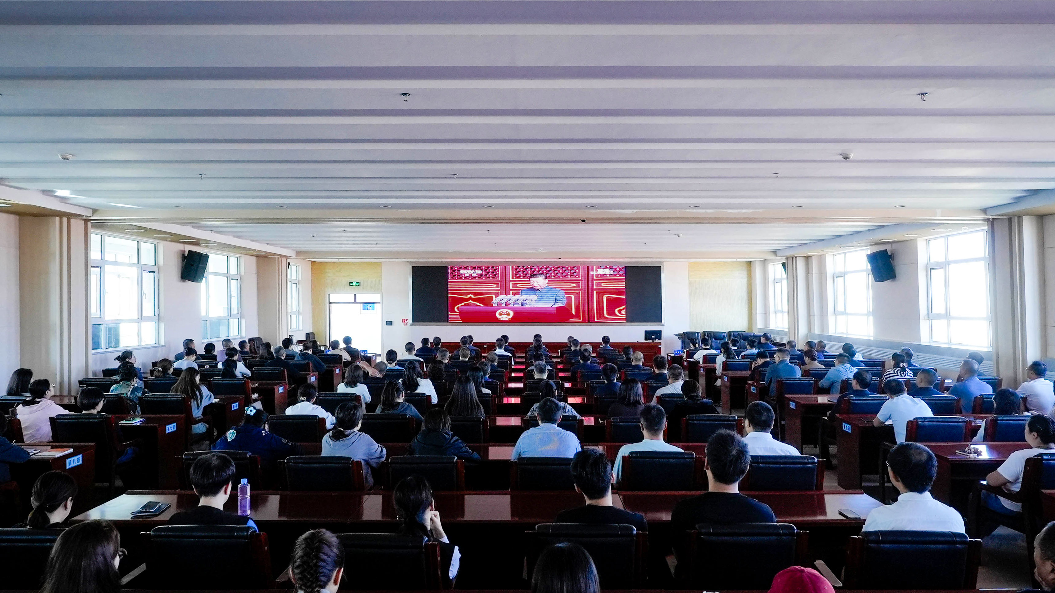 上午9时,全体校领导与行政工勤人员在勤笃楼会议室通过央视直播同步观看大会盛况,各二级学院教职工在本学院会议室集中观看,全体思政课教师紧跟时政,带领学生在阶梯教室观看,校团委组织无课班级同步开展团日活动,由辅导员带领团员学生在教室观看,各专业课教师结合授课内容带领学生在教室观看。