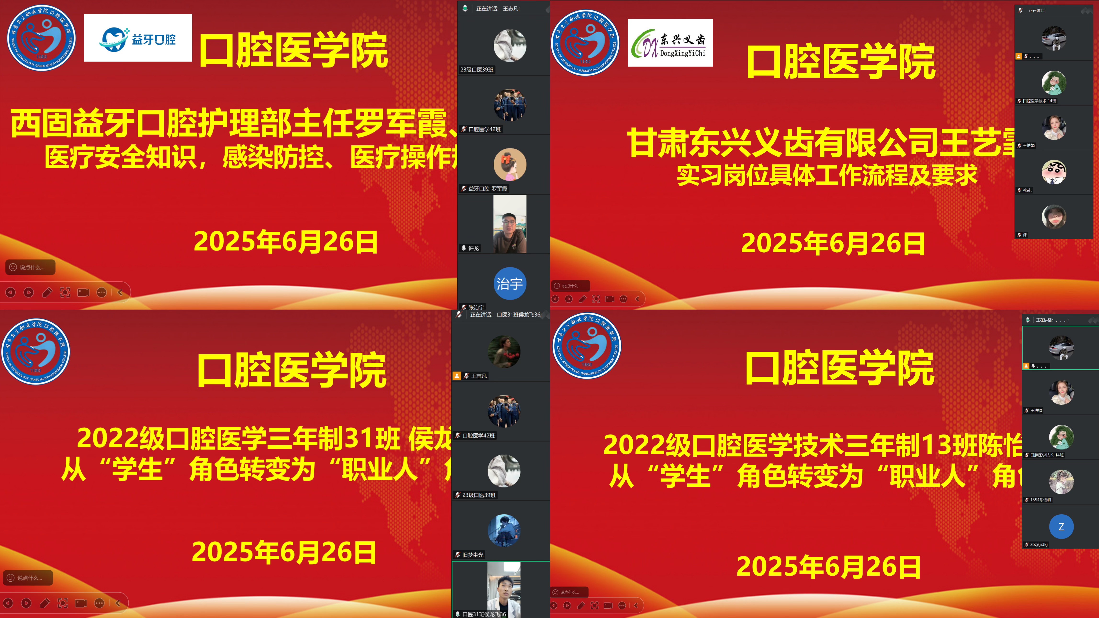 动员会伊始,王祖华、郭艳玲结合口腔医学专业特色,深入阐述实习对专业成长的重要意义,勉励同学们以饱满的热情投身临床实践,在实习中提升专业理论与实践技能。同时,着重强调实习期间须严守规章制度,做好安全防护,快速完成从学生到职场人的角色转变,树立“先就业,再择业”的务实就业观,6月26日晚,学院邀请西固益牙口腔诊所护理部主任罗军霞、许龙围绕“医疗安全知识、感染防控及操作规范”展开细致讲解,筑牢学生实习安全防范意识,甘肃东兴义齿有限公司王艺霏分享“实习岗位工作流程与要求”,助力学生明晰职业方向,优秀校友侯龙飞、陈怡帆结合自身经历,分享实习心得与就业选择经验,着重指出实习是实现“学生”到“职业人”蜕变的关键,鼓励同学们在点滴工作中锤炼职业素养。
