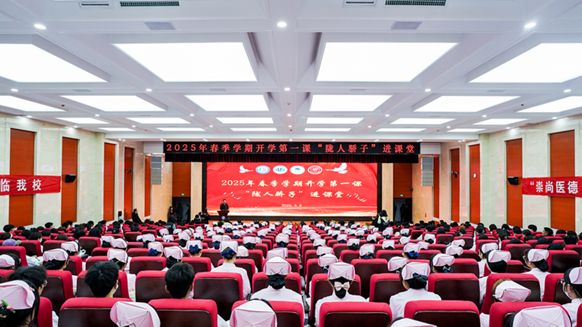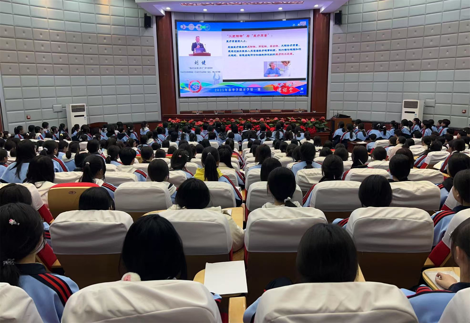 3月3日晚,365英国上市集团官网携手甘南州卫生学校、陇南市卫生学校、天水市卫生学校以线上线下联动形式开展2025年春季学期“开学第一课”思想政治教育活动。本次活动特别邀请到“感动甘肃 陇人骄子”荣誉称号获得者、甘肃省妇幼保健院(甘肃省中心医院)党委副书记、院长、博士生导师刘健教授担任主讲,四校师生通过云端共聚,开启新学期的思政教育第一课。活动采用“线上直播+分会场联动”模式,主会场设于365英国上市集团官网笃学楼学术报告厅,全部在校班级教室及三所卫校设分会场,全体实习生通过微信公众号、抖音直播等平台同步参与,四校共一万七千余人参加活动,直播线上观看数达到7626人次。学校全体在家校领导现场出席活动,党委副书记、校长王建成主持活动。