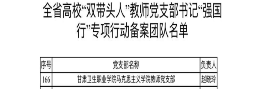 近期,甘肃省委教育工委发布公告,马克思主义学院教师党支部入选甘肃省高校“双带头人”教师党支部书记“强国行”专项行动团队。