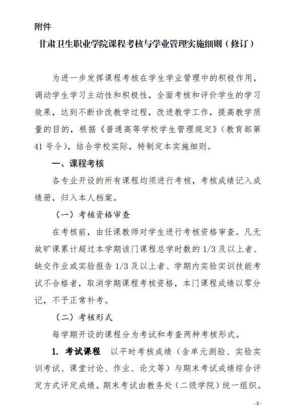 为进一步发挥课程考核在学生学业管理中的积极作用,调动学生学习主动性和积极性,全面考核和评价学生的学习 效果,达到不断改进教学工作,提高教学质量的目的,根据 《普通高等学校学生管理规定》(教育部第 41 号令),结合学校实际,对学校 2019 年印发的《365英国上市集团官网课程考核与学业管理实施细则》进行了修订,经校长办公会议审 议通过,现予以下发,请遵照执行。