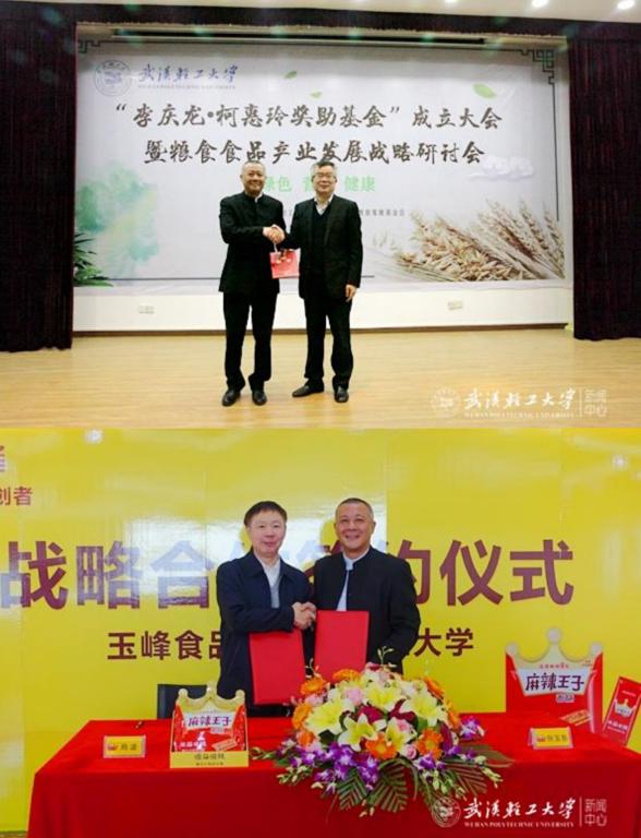2017年11月6日湖南省玉峰食品实业有限公司和武汉轻工大学正式签订战略合作协议,达成战略合作关系,校企合作上升到了一个全新的层次。2018年在李庆龙教授、校党委和以张玉东先生为代表的企业家共同努力下,我校成立了“李庆龙·柯惠玲奖助基金”,主要用于奖励在食品学科品学兼优或科研能力突出的青年教师、研究生及本科生,张玉东先生获聘为第一届理事会理事长。2019年12月26日,在第二届“李庆龙•柯惠玲奖助基金”颁奖典礼上,校党委副书记刘丰林代表校友总会,向张玉东董事长颁发武汉轻工大学001号荣誉校友证书。