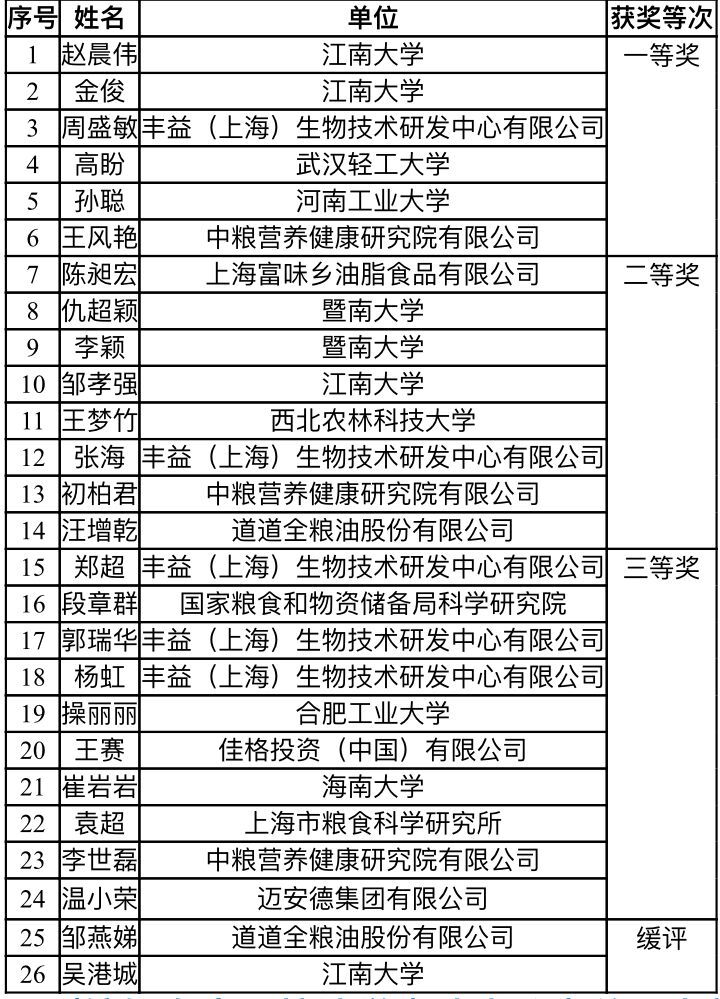 “首届‘瑞元杯’油脂科技青年论坛”论文终评会获奖名单