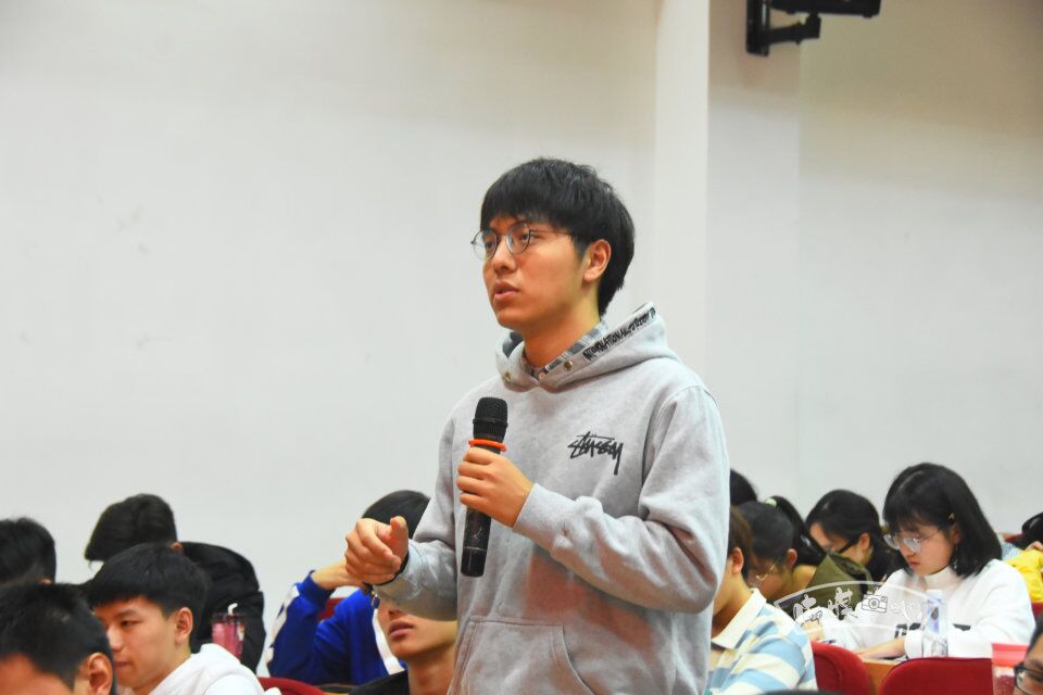 在丁鹏先生做完报告后,三位同学提出了自己的疑问,其中一位同学提问到:“工作经验和考研什么更重要”。丁鹏先生郑重说道:“这个选择要问自己的选择是否会后悔,二者无优势差别,企业看的是软实力”,随后拿自己举例,自己是同行中学历最低,但他不后悔自己的选择,所以走到了现在。丁鹏先生一一解答了三位同学的问题,每位同学都受益匪浅。