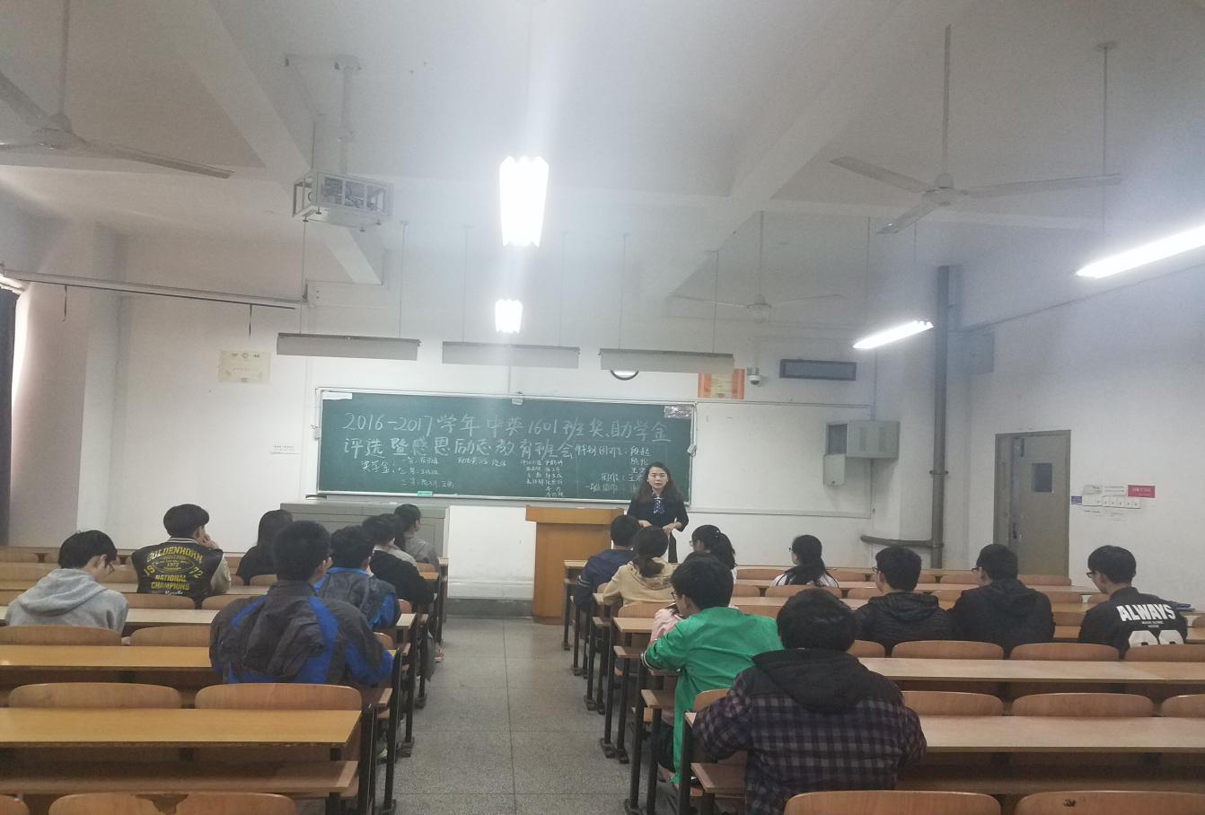 16中英辅导员聂铭静老师将资助感恩与社会主义核心价值观结合在一起,动员获得资助同学与学生干部一起做好表率,诚信做人,努力学习,不断进取,以优异的学习成绩回报祖国的关怀。