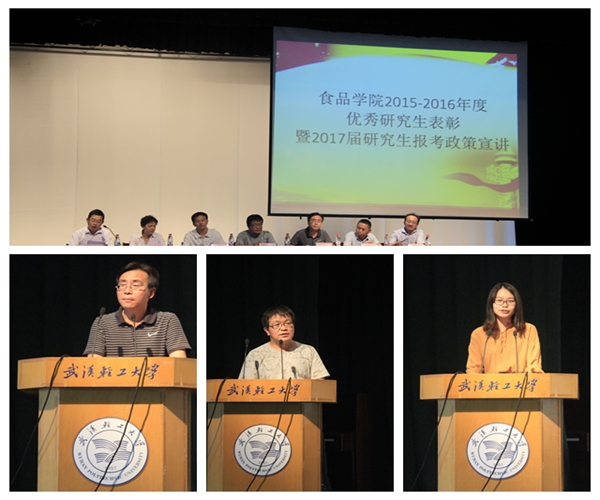 研究生朱哲、付杰、陈娟分别作为优秀研究生干部、科研优秀奖和考研优秀奖的代表在会上发言。朱哲同学分享了自己读研的收获和体会:锻炼了自己的能力 ,认识了优秀的老师和同学,找到了心仪的工作;付杰同学报告了自己从事科研的经历和成就:拥有学院丰厚的导师团队和平台,两年来已经发表了中文核心论文三篇,工程技术一区SCI论文一篇,影响因子平均达到5以上,鼓励研究生同学要不忘初心、继续前行;陈娟同学分享了自身报考研究生的经历,鼓励考研的同学正确认识食品学院的学科优势,积极报考本校研究生。