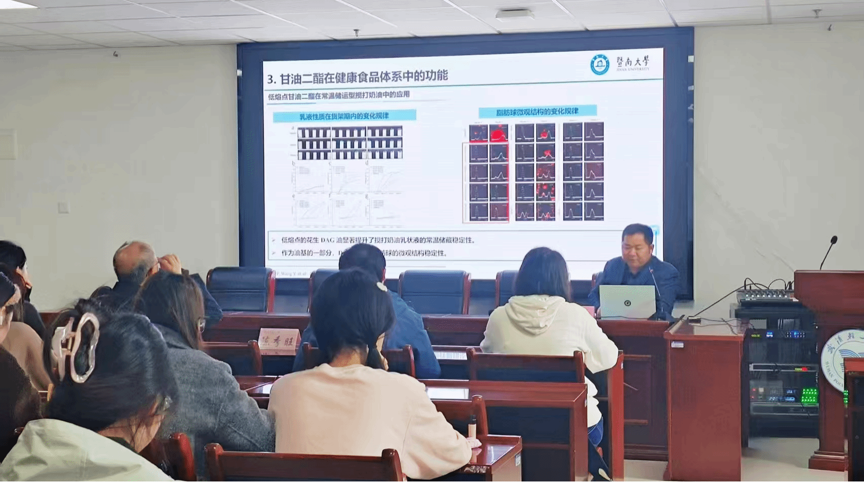 报告中,汪勇教授系统介绍了甘油二酯的酶法催化制备技术及其在健康食品体系中的创新应用。汪勇教授首先从我国油脂工业的发展现状与健康化转型需求出发,阐述了功能性结构脂质研究的重要意义;随后,深入解析了甘油二酯的酶法催化制备机理与工艺优化策略,介绍了团队在固定化脂肪酶筛选、载体改性及底物选择性调控等方面取得的系列创新成果;在功能应用部分,他展示了甘油二酯在低热量乳制品、冰淇淋及蛋黄酱等食品体系中的结构调控和稳定化作用,突出了其在改善脂肪吸收、调控代谢及提升食品质构方面的潜力。最后,汪教授还简要介绍了团队的研究方向与国际合作进展。
