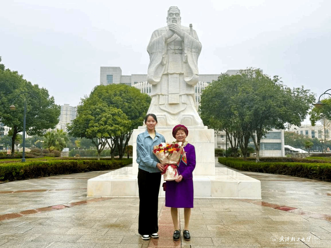活动中,“木蘭”奖学金(朱崇淑2021年9月15日在我校设立的奖学金)获奖学子代表、食品学院学生代表手捧鲜花,向朱崇淑校友表达敬意与感谢。朱崇淑关切询问“木蘭”奖学金获奖学子近况,勉励大家潜心学业、回报社会与母校。当得知获奖学生王吉祥曾作为受阅队员参加九三阅兵仪式时,朱崇淑校友特别称赞她,这份特别经历不仅展现了当代青年“强国有我”的青春风采,更以行动诠释了轻工学子的责任担当,并邀请她在校园孔子像前合影留念,定格下温馨而有意义的瞬间。