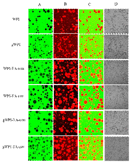 2018, 66(36):9556-9564.; J Agric Food Chem. 2019, 67(18):5212-5220.)。同时,蛋白质和多酚通常在食品加工和生产中结合使用,多酚被用作食品中的功能成分,以提高其营养含量和感官特性。因此,我们选用单宁酸(TA)作为代表性多酚结构,利用其与gWPI通过共价和非共价作用形成蛋白-糖类-多酚三元复合物,评估不同复合物结构对Pickering乳液的稳定性能。