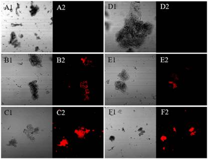 Fig. 1. Effects of COS on serosal membrane injury of A. flavus and A. fumigatus. (A–C) A. flavus treated with 0, 1 × MIC and 2 × MIC COS, respectively. (D–F) A. fumigatus treated with 0, 1 × MIC and 2 × MIC COS, respectively. The numbers 1 and 2 represent bright field and fluorescence images, respectively.