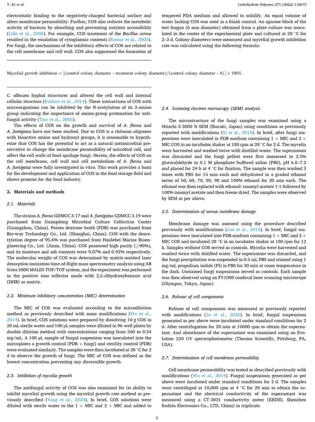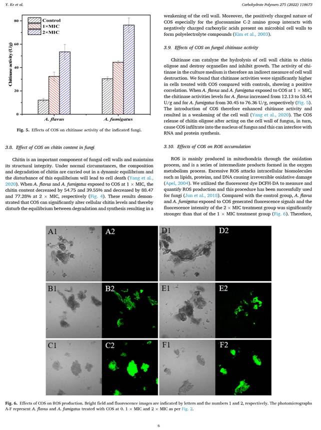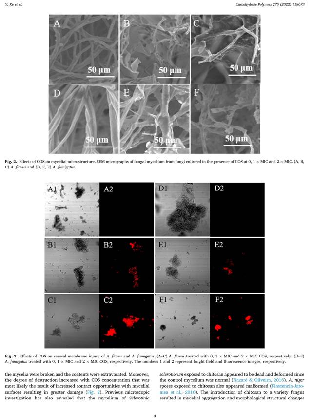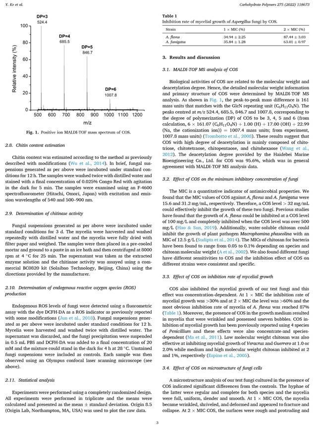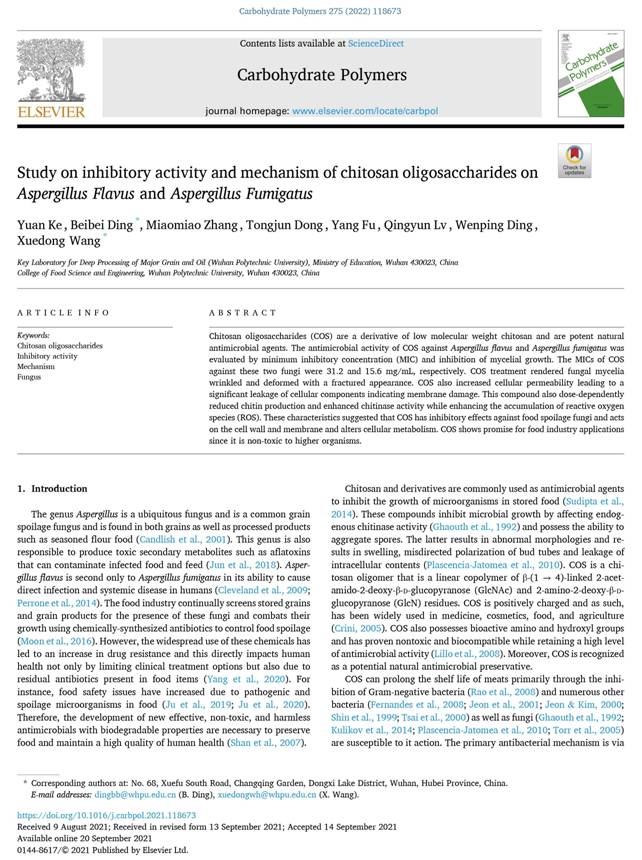近日,武汉轻工大学食品学院谷物团队以“Study on inhibitory activity and mechanism of chitosan oligosaccharides on Aspergillus Flavus and Aspergillus Fumigatus”为题在Carbohydrate Polymers(Carbohyd. Polym. 275 (2022) 118673)上发表最新研究成果,报道了壳寡糖(COS)对腐败真菌的抑菌活性及抑菌机理的研究工作,为COS在食品贮藏领域的开发和应用提供理论和技术支撑。