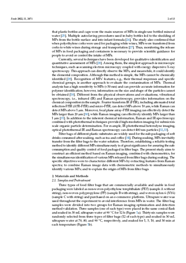 微塑料(MP)污染是环境和人类健康的公共问题。基于塑料的食品过滤袋,包括聚对苯二甲酸乙二醇酯、聚丙烯、尼龙6 (NY6)和聚乙烯,被广泛用于软饮料分装,增加了食品和环境中 MPs 的风险。收集了三种市售过滤袋,包括无纺布和编织袋,并使用拉曼成像结合化学计量学对浸泡后释放的MPs进行了映射。与单个特征峰的峰面积成像相比,拉曼成像结合直接经典最小二乘计算对于MP特征的识别更加有效和可靠。高达94%的袋子在浸泡后释放MPs,与浸泡条件无显着相关性。大多数MPs是微小的碎片和颗粒,少数是大小为 620-840μm的纤维状MPs。编织的NY6过滤袋释放MP的风险最低。过滤袋的来源探索表明,大多数MPs来源于吸附在袋子和绳子表面的碎片和颗粒。本研究结果适用于滤袋风险评估,为食品中MPs的监管提供科学指导。