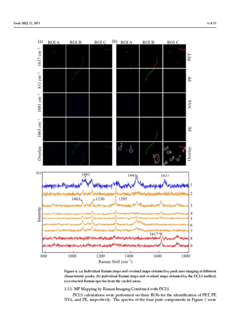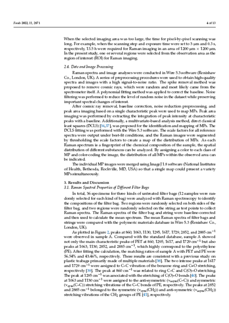 拉曼成像技术的分辨率可以达到1μm,可以检测和识别微塑料的种类,并能通过图像展示微塑料的分布和大小。实验中拉曼成像结合化学计量学方法(直接经典最小二乘)可以较为准确的检测到微塑料。对36个茶叶滤袋的检测结果表明,高达94%的滤袋在浸泡过程中释放MPs,释放的MPs主要来源于PET、PP、PE等无纺布滤袋和各种塑料制成的绳子。这些也表明,使用塑料食品过滤袋对软饮料进行分装时可能会因MP污染而对人类健康造成潜在风险。总体而言,基于拉曼成像的MP映射方法可方便直观地识别MP及其分布。此外,初步结果提供了一种研究MPs从过滤袋中释放的方法,对食品控制和MP监管具有重要意义。