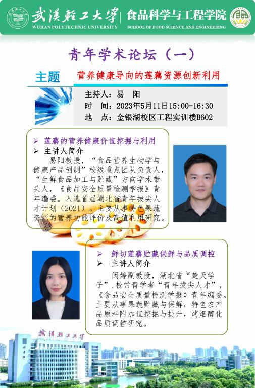 2023年5月11日,由“食品营养生物学与健康产品创制”校级重点团队组织召开了第一场主题为“营养健康导向的莲藕资源创新利用”的学术交流活动,主持人为团队负责人易阳教授,食品学院20余名青年教师参加了本次活动。