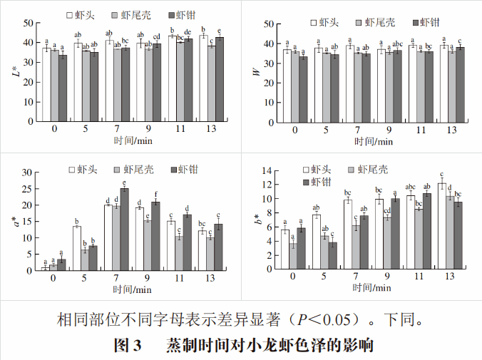小龙虾的颜色是影响消费者选择的一个重要因素。一般来说,小龙虾经过热加工熟制后会变成红色,主要表现在小龙虾的外壳上。本实验对不同蒸制和水煮时间下小龙虾各部位外壳的色泽进行测定,由图3、4可知,小龙虾的大部分颜色指数(即L*、a*和b*值)在热加工后都有所增加。0 min为生鲜小龙虾L*、a*和b*的初始值。随着蒸制时间的延长,小龙虾的L*值出现缓慢增加,W值整体无显著变化。小龙虾在水煮加工中的L*、a*、W值的变化趋势与蒸制相似,L*和W值整体变化趋势不大,经水煮加工后出现小幅度的增加。蒸制、水煮过程中小龙虾的a*值发生了显著变化(P<0.05),随着热加工时间的延长,a*值呈现先上升后下降的趋势,a*值的变化主要与虾青素的含量有关。在蒸制、水煮过程中,小龙虾体内与虾青素结合的蛋白质等组分逐步受热降解,导致虾青素从蛋白结合态释放出来,游离的虾青素含量增多,使小龙虾发生红变现象,导致a*值升高;当蒸制时间超过7 min或水煮时间超过11 min时,游离态虾青素自身可能发生受热降解、氧化分解或异构化以及随着水分降低而流失,最终导致虾青素含量减少,造成a*值下降。b*值的变化主要与脂质氧化有关,加热后游离虾青素的含量显著增加,酯化虾青素含量减少,随着热加工时间的延长,黄度逐渐上升。小龙虾中脂质氧化程度提高,其中虾头中的脂质含量最高,因此其黄变现象也最明显。Ho等认为酯化虾青素向游离态虾青素的转变可能是产生色素的重要途径,因此加热后的小龙虾会显红色。b*值随着水煮时间的延长呈逐渐上升趋势,可能是因为脂质氧化以及美拉德反应褐变生成黄色素。结合表3可知,热加工中小龙虾各部位a*值的变化与虾青素含量的变化存在正相关关系,有较高的相关性(r>0.4),与张旭飞等得出的结论一致。小龙虾色泽变化还与类胡萝卜素结合蛋白有关,Pan Chuang等从克氏原螯虾的外壳中纯化了两个与红色相关的蛋白,在加热处理过程中其含量与克氏原螯虾表面的红色变化表现出强烈的相关性,并被鉴定为血蓝蛋白亚基。今后可结合起来进行深入研究。
