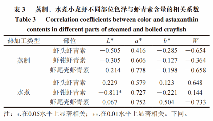 3 蒸制、水煮加工前后小龙虾虾青素含量变化与显色变化相关性