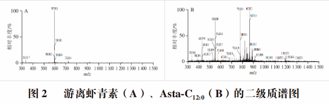 使用高效液相色谱对小龙虾中虾青素酯的组成进行检测,结合质谱分析对这些峰进行鉴定。图2是游离虾青素和虾青素单酯Asta-C12:0的二级质谱图。游离虾青素的相对分子质量为596.39,在正离子条件下带1 个正电荷,所以游离虾青素的分子离子峰[M+H]+为m/z 597.39。虾青素酯在正离子模式下的破碎以水分子和脂肪酸作为中性分子的丢失为主。目前由于虾青素的标准品种类不完整,对虾青素进行定性分析主要根据精确质荷比、提取离子流图以及特征性离子碎片确定。化合物的分子质量和虾青素的特征性离子可以对虾青素单酯进行定性。Asta-C12:0的特征性离子峰[M+H]+为m/z 779.56。虾青素环状分子结构的两端各连接一个羟基,该基团可以与脂肪酸发生化学反应形成酯类。当一端的羟基与脂肪酸反应时,可形成虾青素单酯。当这两个羟基与脂肪酸反应时会形成虾青素双酯。