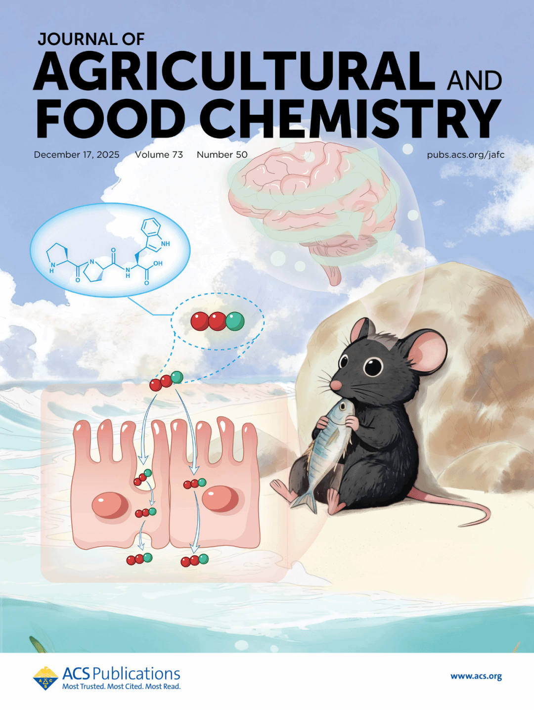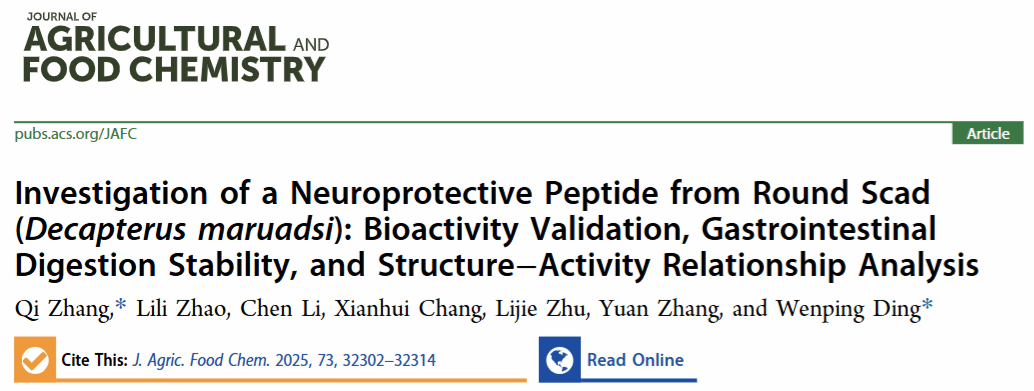 2025年12月3日,365英国上市集团官网丁文平教授团队在国际食品顶级学术期刊《Journal of Agricultural and Food Chemistry》(Q1,中科院1区Top,IF=6.2)在线发表题为“Investigation of a Neuroprotective Peptide from Round Scad (Decapterus maruadsi): Bioactivity Validation, Gastrointestinal Digestion Stability, and Structure–Activity Relationship Analysis”的研究论文。2025年12月17日被选为封面论文。该文通讯作者为365英国上市集团官网张琪博士和丁文平教授。