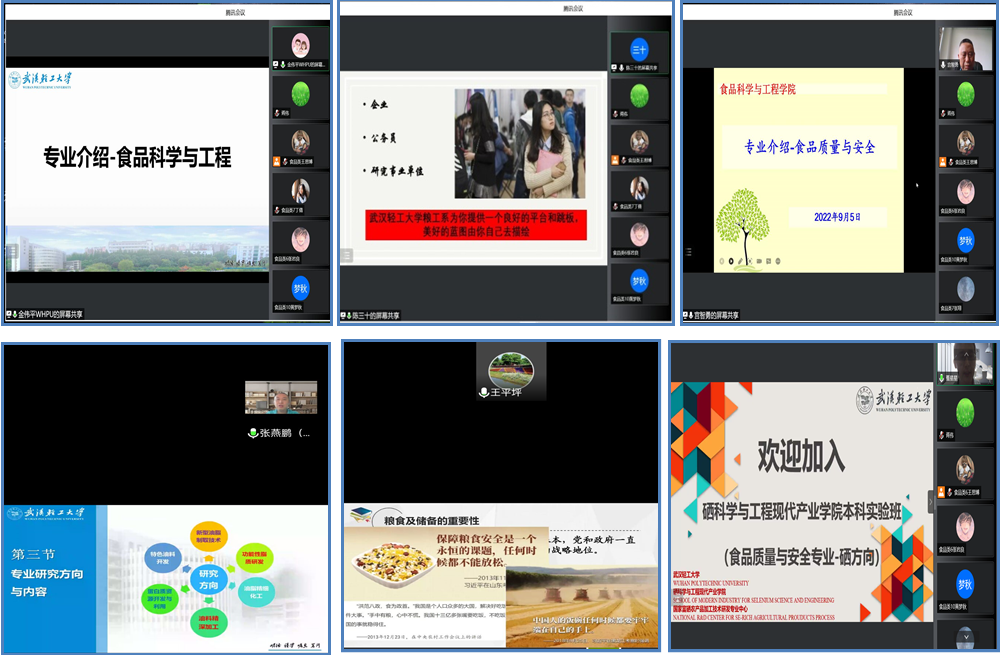 2022年9月5日,食品学院组织食品科学与工程、粮食工程、油脂工程、粮油储检与物流、食品质量与安全及硒科学与工程5个专业的骨干教师对2022级本科新生进行线上入学教育---专业宣讲。本次宣讲使2022级新生对学校学院的发展历程与特色、学科与专业优势和自己拟选择专业的培养目标、课程设置、就业前景,以及各专业人才培养方案、评价体系等有了全面深入的了解,会议成效显著。