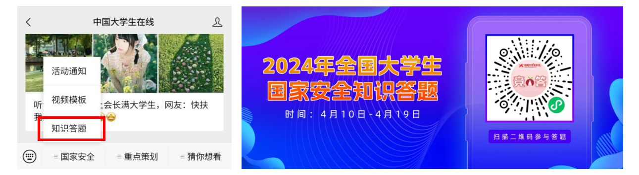 3.完成一次主题竞答。通过中国大学生在线微信公众号或直接微信扫描下方二维码,积极参加“全国大学生国家安全知识答题”活动。请各班级于4月14日晚21:00前上交答题截图(截图上标注姓名)至钟秋(QQ:3259158363 电话:19822957528)处,请大家实名参加,勿弄虚作假。
