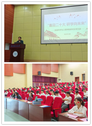10月12日下午,食品学院研究生第一至第九党支部在图书馆三楼学术报告厅联合开展了主题为“喜迎二十大,研学向未来”的主题党日活动。食品学院党委书记胡中泽,专职组织员饶春红,研究生辅导员汪娴、李吉绪以及全体研究生党员参加了本次活动。