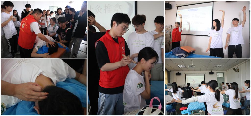 在湖北中医药大学昙华林校区实训中心,食品学院的研究生们体验了湖北中医药大学的研究生们带来的艾灸推拿,同时也向他们赠送了亲手制作的青团。不论是艾条还是青团,它们都有一个共同的原料——艾蒿,这正是“药食同源”理念的最好体现。在中国的传统文化中,食物和药物并没有本质的区别,都是通过调节人体内部的阴阳平衡来治疗疾病和保持健康。“药食同源”理念体现了传统文化中的养生保健思想,以及对自然和生命的深刻认识和理解,与武汉轻工大学“大食品大营养大健康”发展理念有着异曲同工之妙。参与活动的师生还一起练习了八段锦。