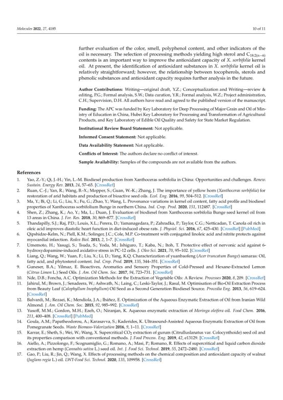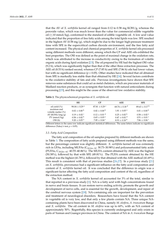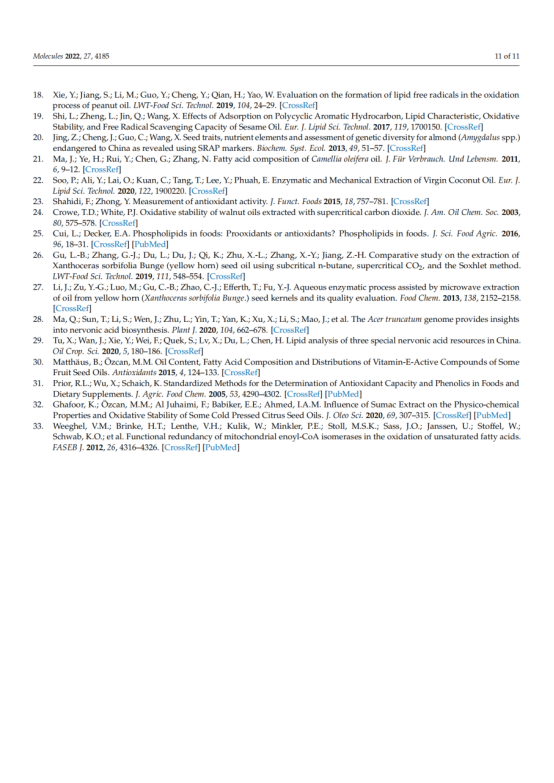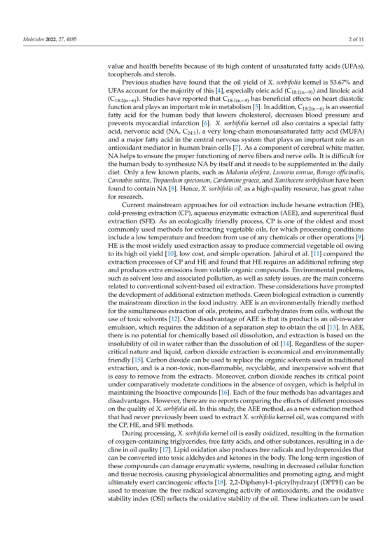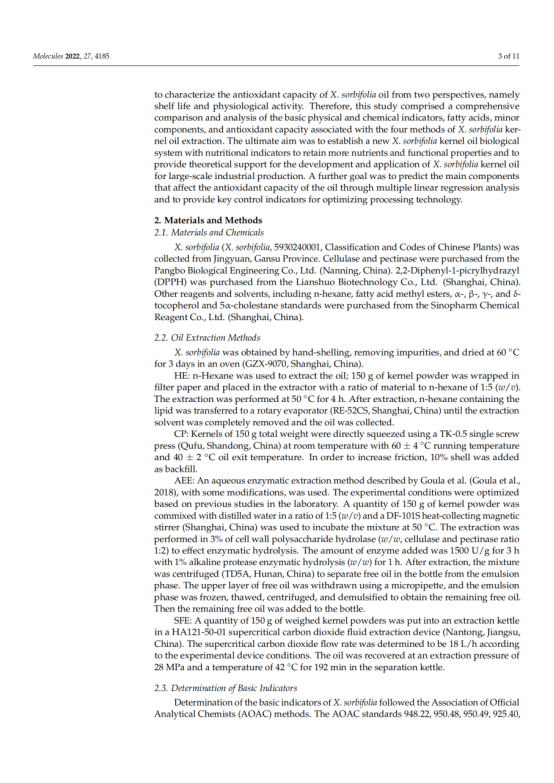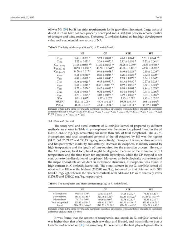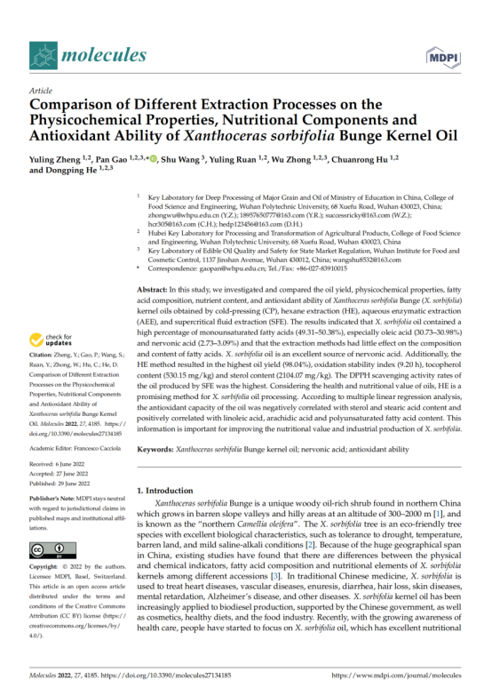 本文对冷榨法(CP)、正己烷萃取(HE)、水酶法(AEE)和超临界流体萃取法(SFE)制备的文冠果仁油的出油率、理化性质、脂肪酸组成、营养成分及抗氧化能力进行了研究和比较。结果表明,文冠果油中单不饱和脂肪酸的含量较高(49.31 ~ 50.38%),其中油酸(30.73 ~ 30.98%)和神经酸(2.73 ~ 3.09%)含量最高,提取方法对脂肪酸的组成和含量影响不大。文冠果油是神经酸的极佳来源。此外,HE法的油得率最高(98.04%),氧化稳定指数最高(9.20 h),生育酚含量最高(530.15 mg/kg),甾醇含量最高(2104.07 mg/kg)。SFE产油对DPPH的清除率最高。考虑到油脂的健康和营养价值,HE是一种很有前途的加工方法。多元线性回归分析表明,油的抗氧化能力与甾醇、硬脂酸含量呈负相关,与亚油酸、花生酸、多不饱和脂肪酸含量呈正相关。这些信息对提高文冠果的营养价值和工业化生产具有重要意义。