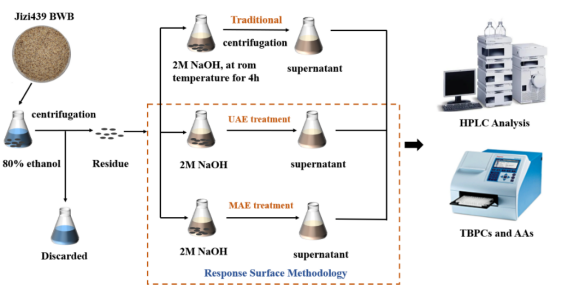 本研究利用响应面法优化UAE和MAE的提取工艺,并比较了UAE、MAE和传统碱提法在最佳提取条件下的结合酚含量、抗氧化活性和结合酚组分。