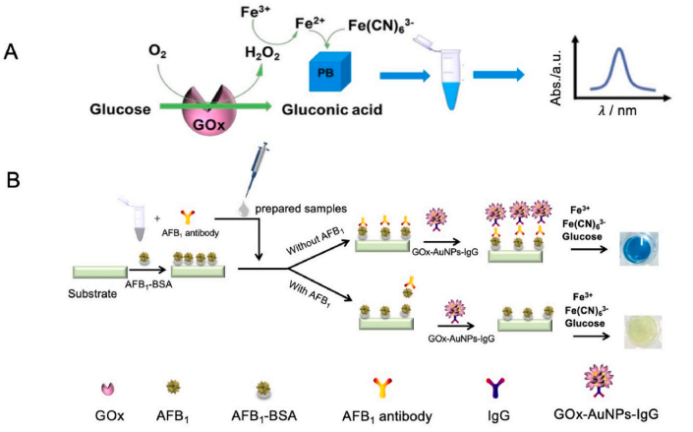 1. 研究团队开发了一种基于葡萄糖氧化酶(GOx)催化生成PB纳米颗粒的比色生物传感器,与免疫分析相结合,以GOx标记的纳米金作为信号转导标签,催化混合底物(葡萄糖及其PB前体物)形成PB。建立了以PB为比色探针的间接竞争免疫法来检测粮食中的痕量AFB1。研究所构建的AFB1定量分析模型的相关系数为0.98,检测限为0.35 ng/mL,对其他常见的真菌毒素也具有良好的选择性以及准确性,成果发表在《LWT-Food Science and Technology》。文章链接:https://doi.org/10.1016/j.lwt.2022.113500