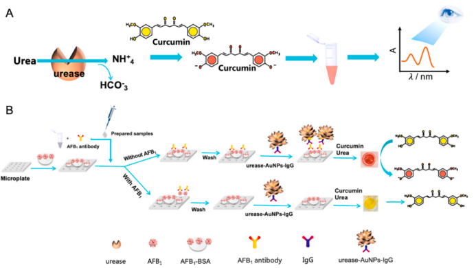 2. 研究团队以姜黄素作为显色试剂,以脲酶标记的纳米金作为信号转导标签,对米粉和面粉中的AFB1含量进行定量分析。所构建的AFB1定量分析模型的相关系数为0.99,检测限为67 pg/mL,成果发表在《Talanta》。文章链接:https://doi.org/10.1016/j.talanta.2022.123495