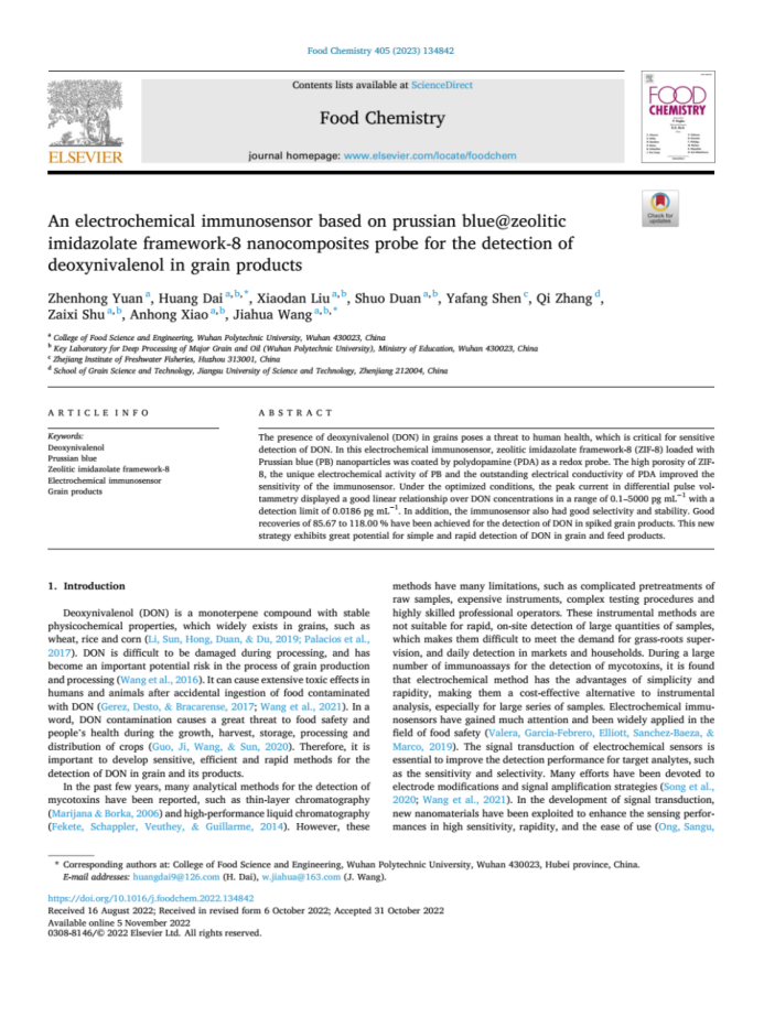 近日,粮油储检与技术流通团队在真菌毒素和农药检测方面取得重要进展,成果陆续发表在国际著名学术期刊《LWT-Food Science and Technology》(中科院1区,IF2021=6.056)、《Talanta》(中科院2区,IF2021=6.556)、《Food Chemistry》(中科院1区,IF2021=9.231)和《Microchemical Journal》(中科院2区,IF2021=5.561)。