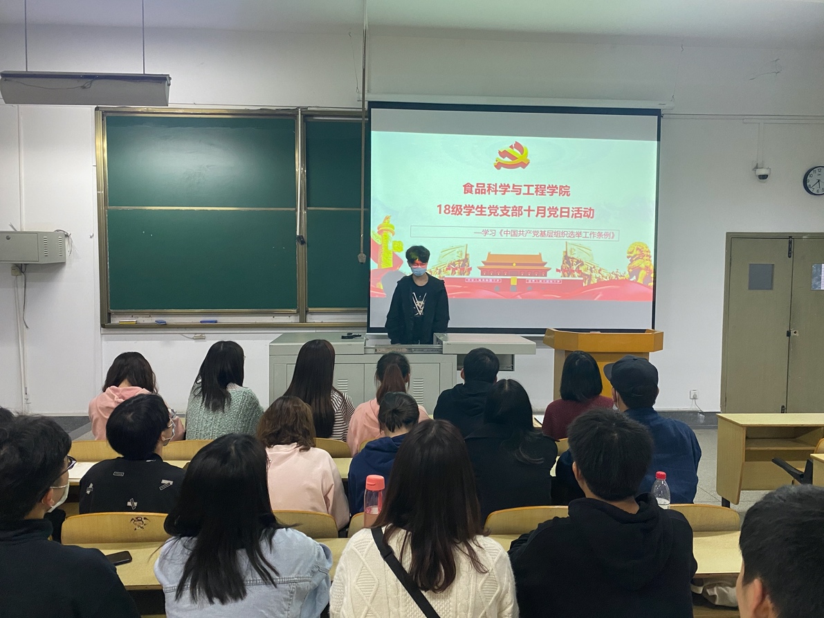 为了深入贯彻习近平新时代中国特色社会主义思想,贯彻落实新时代党的建设总要求和新时代党的组织路线,坚持和加强党的全面领导,坚持党要管党、全面从严治党,健全党的民主集中制,完善党内选举制度,增强基层党组织政治功能,提升基层党组织组织力,食品学院18级学生党支部于 10月29日晚5点30分在科教211教室集中学习了《中国共产党基层组织选举工作条例》。