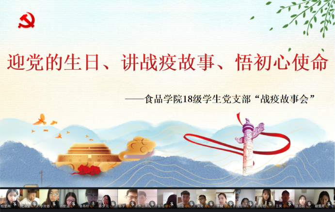 临近“七一”之际,为贯彻落实学校在各基层组织开展党建“四个一”活动的通知精神,充分发挥基层党组织战斗堡垒作用和师生党员先锋模范作用,6月29日上午九点,食品学院18级学生党支部在支部书记牟星和张舟的组织下顺利开展以“迎党的生日、讲战疫故事、悟初心使命”为主题的“战疫故事会”。