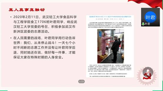在这疫情收官的重要时期,由叶君同学向支部成员们讲述自己的抗疫故事,一天七个小时不间断的志愿工作并没有让叶君同学后退,同时她还在说,做好每一件事,才能保证大家在特殊时期的人身安全。叶君同学的行为很好地展现了什么是有知有行有担当,是一个值得我们所有党员同学学习的良好品质。