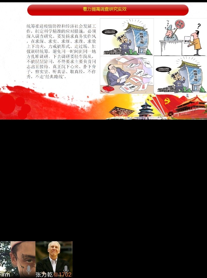 会议主持人张力乾首先结合PPT介绍了新型冠状病毒的定义、症状,并重点讲解新型冠状病毒防控措施,特别强调了在返校途中和返校后同学们应当如何全面做好防护措施,保障好返校后的正常学习、生活秩序。之后主持人张力乾结合《杜绝形式主义,为基层松绑减负》的主题,带领大家学习了党中央决策部署中坚决纠治、杜绝形式主义和官僚主义的要求部署,过程中穿插的“习言习语”,使观点更生动更有说服力。