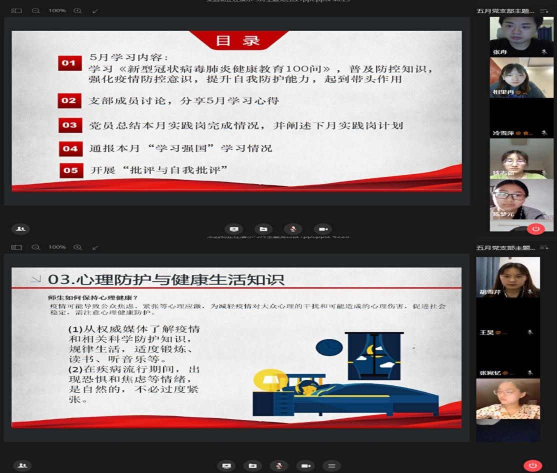 主持人朱远韧宣布活动开始,他对照《新型冠状病毒肺炎健康教育100问》,细致入微地向支部全体成员讲述了新型冠状病毒的来历、传播途径、预防方法等相关知识,并且分享了心理防护和健康生活知识。在集中学习过后,相里冉同学分享了自己的学习体会,她说:“作为武汉的一名大学生,更作为一名中共预备党员,在关键时刻必须站出来。我们要带头配合学校学院的安排,带动同班同学认真进行线上学习,利用在学习强国上学习到的知识给同学们进行防控科普。作为党员也要主动关心同学们的健康以及心理状况,履行自己在疫情防控阻击战中的责任。”