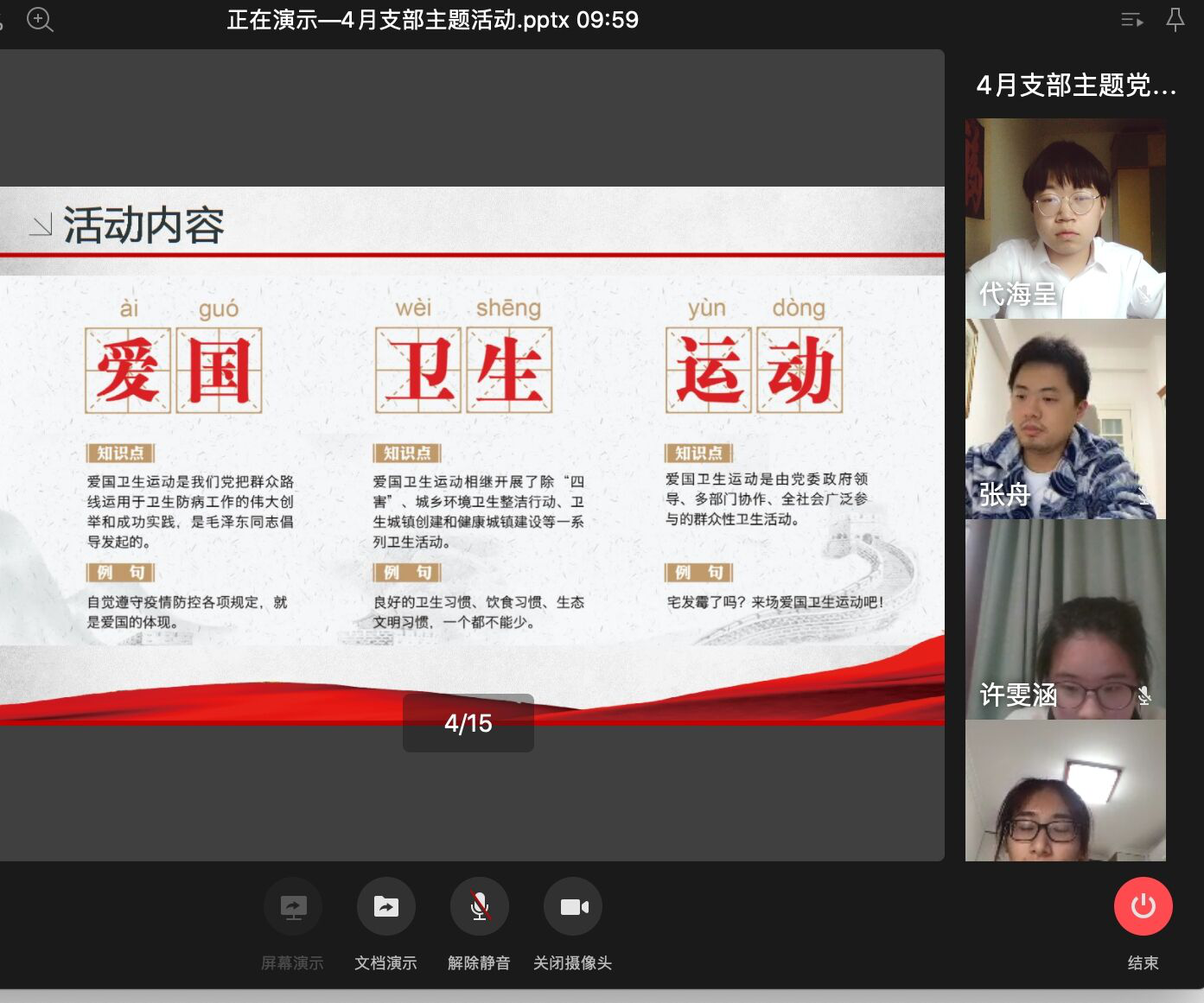 主持人代海呈同学宣布活动开始,铁志茹同学带领支部全体成员学习了《关于开展第32个爱国卫生月活动为全面打赢新冠肺炎疫情阻击战营造良好环境的通知》有关内容,并结合资料讲解了爱国卫生运动的历史、开展爱国卫生运动的意义,倡导党支部内全体党员学习爱国卫生运动精神。在学习中铁志茹同学分享着自己的体会,“作为一名学生党员,我们要深刻认识到爱国卫生运动的内涵:爱国是核心、卫生是根本、运动是方式。要深入学习爱国卫生运动精神,并运用到实际中去,积极参加爱国卫生运动,积极响应《动员广大群众积极参与爱国卫生运动的倡议书》,向周围同学,亲戚邻里宣传卫生运动精神,从自我做起,从身边小事做起,注重卫生,摒弃陋习,当好自己健康第一责任人,养成文明健康、绿色环保的生活方式。”