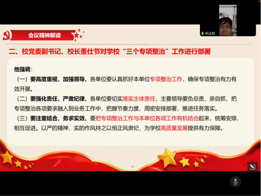 接着,重点学习了身为党员必须履行的义务,详细介绍了习近平总书记在中共中央政治局第五次集体学习上的讲话精神。培养什么人、怎样培养人、为谁培养人是教育的根本问题,也是建设教育强国的核心问题。引导学生树立坚定理想信念,永远听党话、跟党走,矢志奉献国家和人民。最后介绍了学校本次主题教育工作推进会暨“三个专项整治”动员会精神的主要内容,会议中王书记强调要及时跟进学习习总书记最新讲话精神和指示批示精神、运用好“深、实、细、准、效”五字诀,牢牢把握高质量发展,落实三个专项整治工作方案及其部署。
