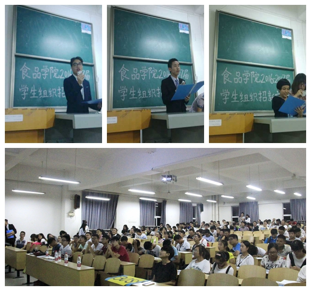 本报讯(食品学院 许敏武 摄影:王琛 胡佳成)为了进一步吸纳人才,推进共青团工作改革,发挥学生组织自我教育、自我管理、自我服务功能。9月19日,食品学院各学生组织2016年招新宣讲大会在KJ303、203顺利举行。院分团委书记许敏武、聂铭静、16级新生辅导员罗霄以及全体16级新生参与此次宣讲。