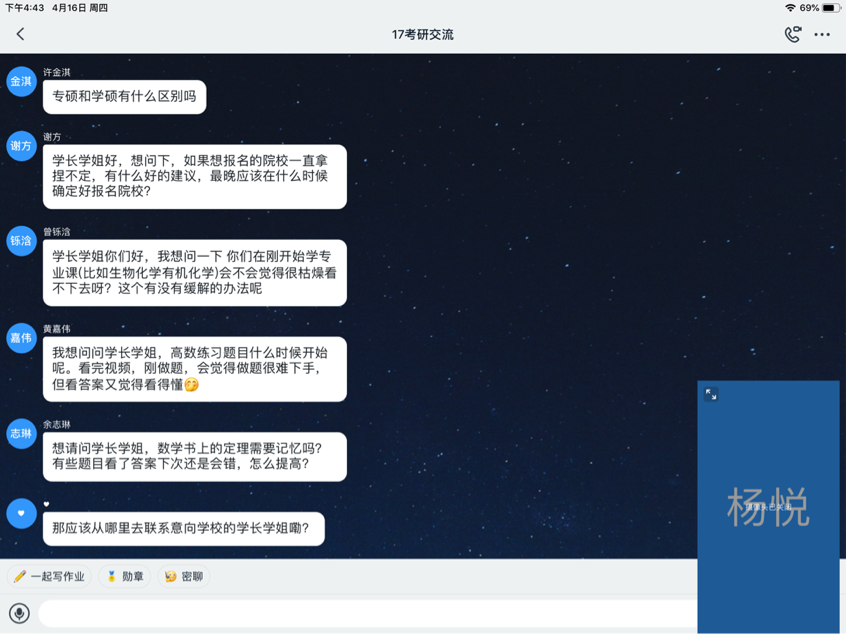 接着,会议进行答疑环节,在疫情面前虽然只能线上开展交流,但同学们考研热情不减,纷纷提出有关复习方法和如何择校等问题。16级分享的同学依次给大家解惑,知无不言、毫无保留的分享学习经验,帮助大家选择目标院校,解决现阶段的问题,从而更高效的进行接下来的复习。