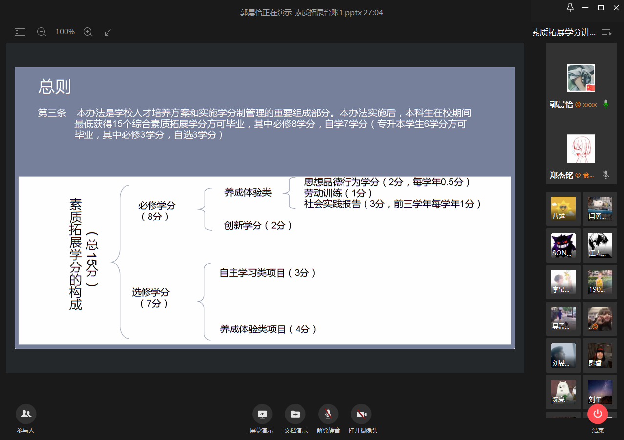 为了让19级的同学们更好地了解大学生综合素质拓展学分的评分标准和申报流程,同时在疫情期间探讨班级和寝室管理新思路,食品学院于4月10日晚7点通过网络视频的方式召开了大学生综合素质拓展学分讲解及认定培训会议。